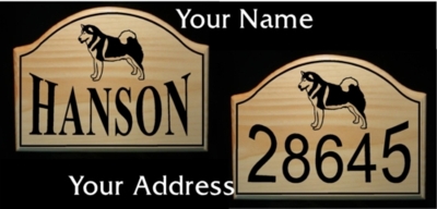 It is constructed on clear coated solid pine and features a silhouette of the Alaskan malamute, add your name, and/or your address. We will personalize this sign any way you would like.