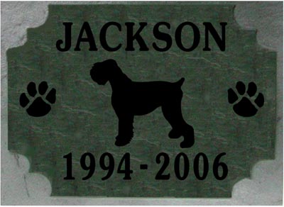These vermont slate memorials Feature all of our very own dog breed silhouettes, horse silhouettes, and more. This quarry cut slate has a nice green/grey color, with many beautiful grains. Your pet memorial is sand blasted, primed, painted, and sealed, so it will last forever outside. Detailed and durable, these memorials come in two sizes, 6" x 8" or 8" x 12".