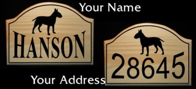 It is constructed on clear coated solid pine and features a silhouette of the Bull Terrier, add your name, and/or your address. We will personalize this sign any way you would like.