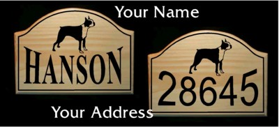 It is constructed on clear coated solid pine and features a silhouette of the Boston Terrier, add your name, and/or your address. We will personalize this sign any way you would like.