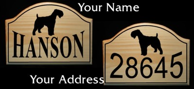 It is constructed on clear coated solid pine and features a silhouette of the Kerry Blue, add your name, and/or your address. We will personalize this sign any way you would like.