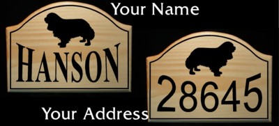 It is constructed on clear coated solid pine and features a silhouette of the King Charles Cavalier, add your name, and/or your address. We will personalize this sign any way you would like.