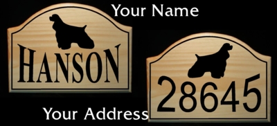 It is constructed on clear coated solid pine and features a silhouette of the Spaniel Cocker, add your name, and/or your address. We will personalize this sign any way you would like.